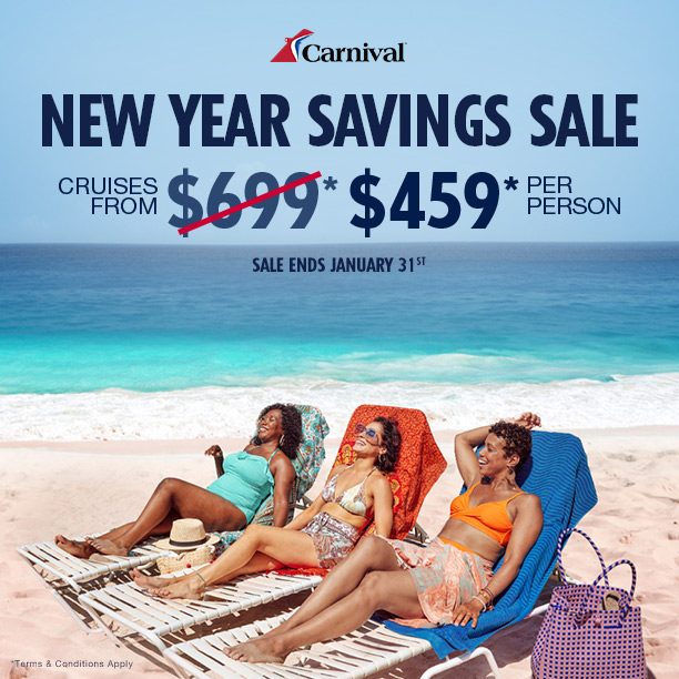 January is a great time to book a Carnival cruise! During their New Year Savings Sale, you can find some great deals! Contact us and let us help you find the perfect cruise, whether it be a romantic getaway, a family trip, or even a group adventure!